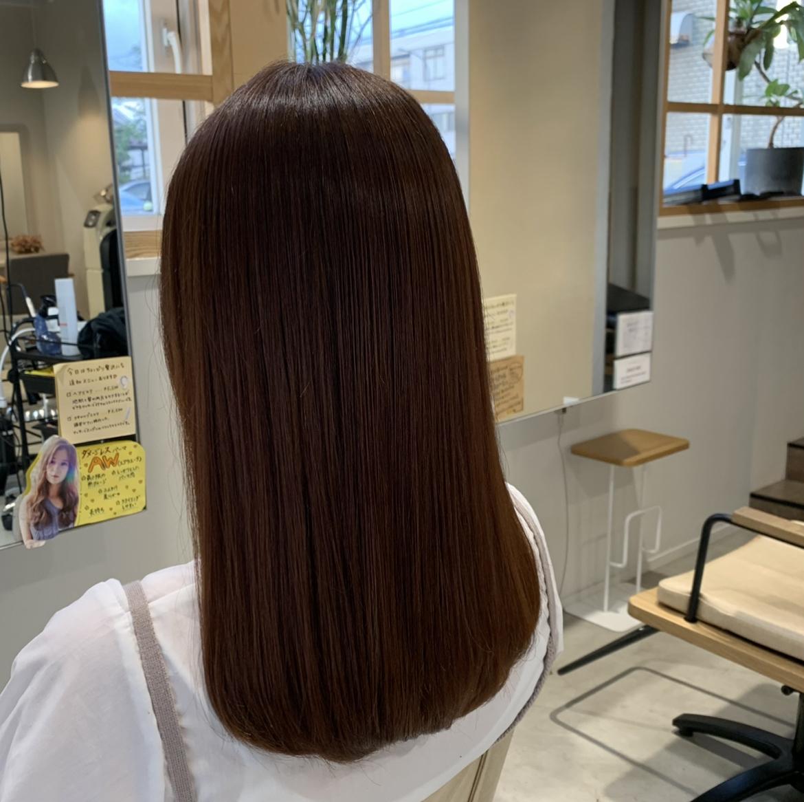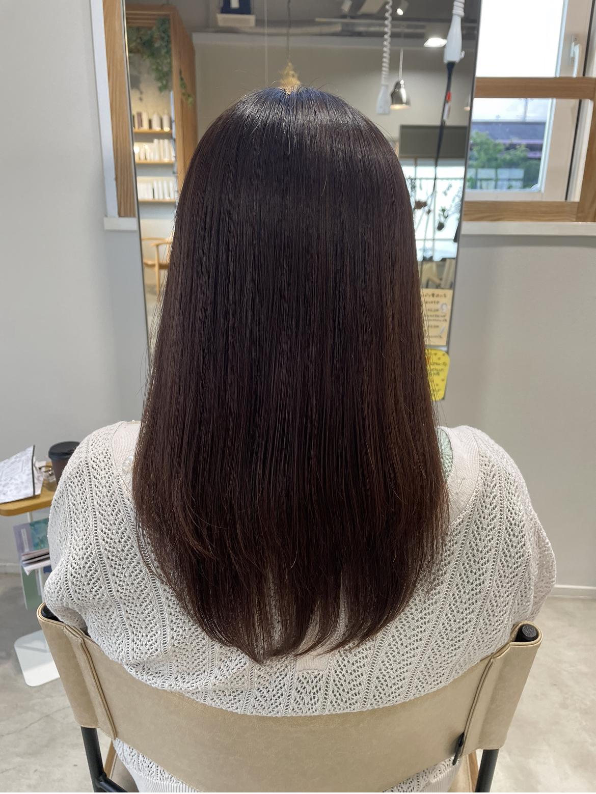 S字のうねりやクセが気になる方向けです。髪に優しい弱酸性の薬剤で真っ直ぐ過ぎない自然な艶のあるストレートヘアに。